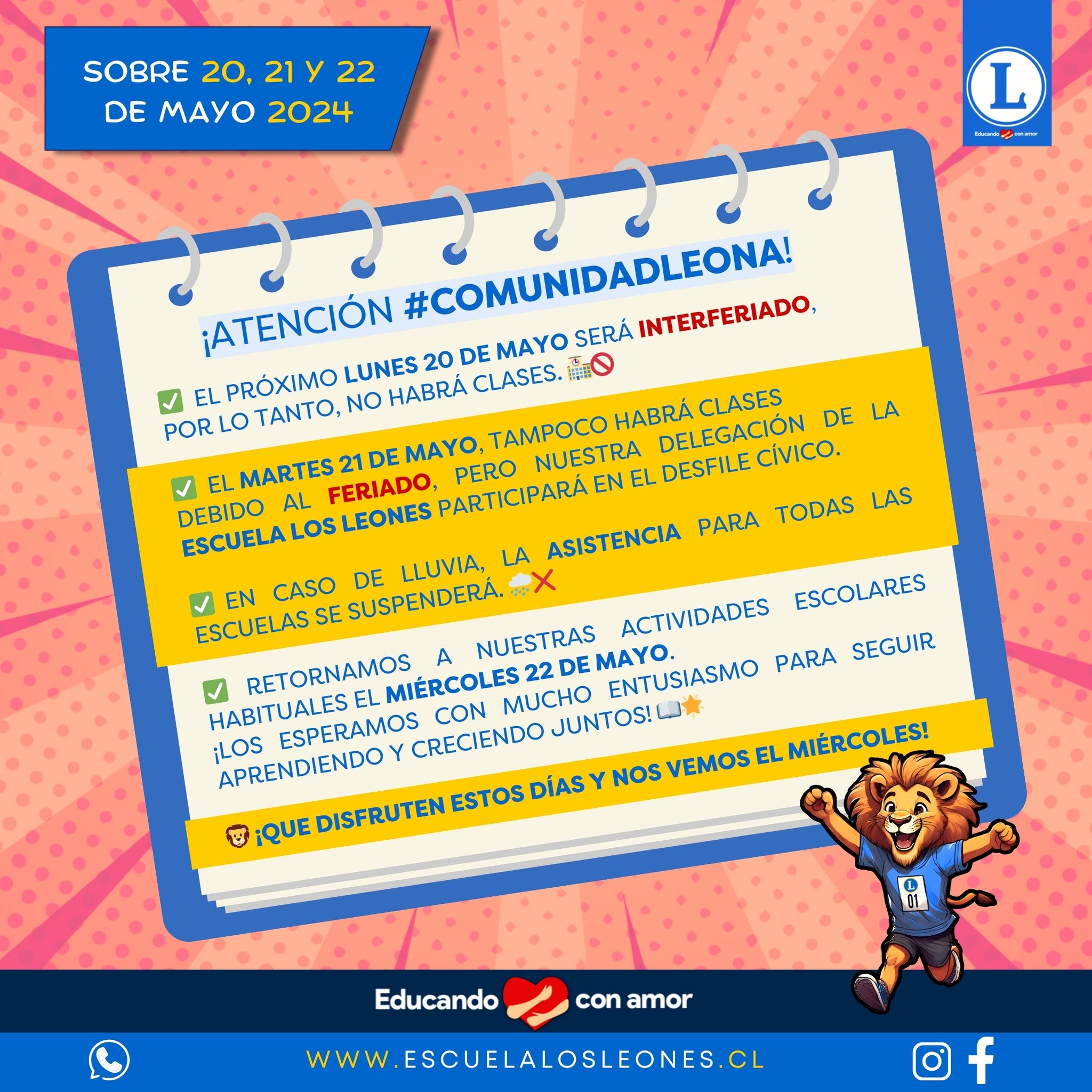 🗓️ El 𝐌𝐀𝐑𝐓𝐄𝐒 𝟐𝟏 𝐃𝐄 𝐌𝐀𝐘𝐎, tampoco habrá clases debido al feriado, pero nuestra delegación de la Escuela Los Leones participará en el desfile cívico. 🎉🇨🇱 En caso de lluvia, la asistencia para las escuelas se suspenderá. 🌧️❌