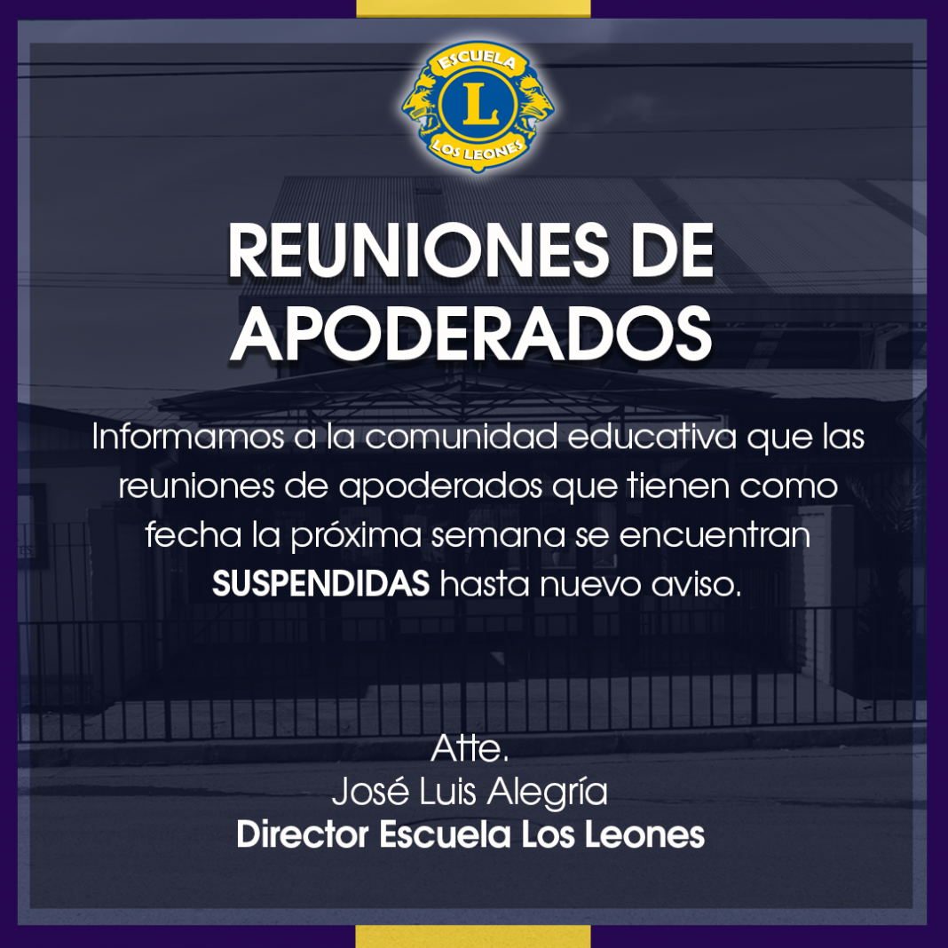 Debido a la situación del país y nuestra comuna, las reuniones de apoderados que tenían como fecha la próxima semana, se encuentran suspendidas hasta nuevo aviso.