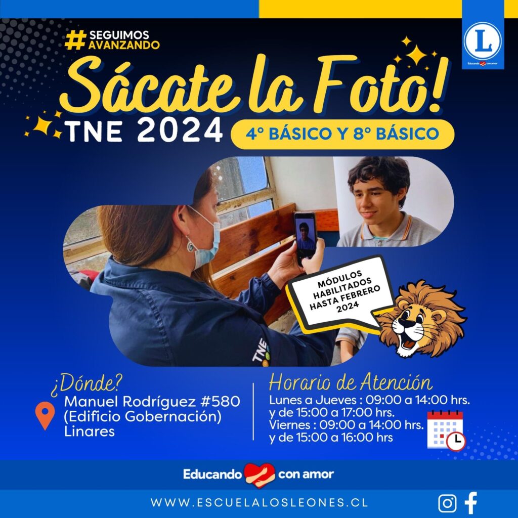 📢 ¡Atención #ComunidadLeona! 🦁 Desde el 13 de noviembre hasta 𝐅𝐞𝐛𝐫𝐞𝐫𝐨 𝟐𝟎𝟐𝟒, los módulos TNE estarán disponibles para 📷 𝑪𝒂𝒑𝒕𝒖𝒓𝒂 𝒇𝒐𝒕𝒐𝒈𝒓𝒂́𝒇𝒊𝒄𝒂 📷 para los alumnos de 𝟒𝐭𝐨 𝐲 𝟖𝐯𝐨 𝐛𝐚́𝐬𝐢𝐜𝐨 en el Edificio Gobernación de Linares (Manuel Rodríguez #580).